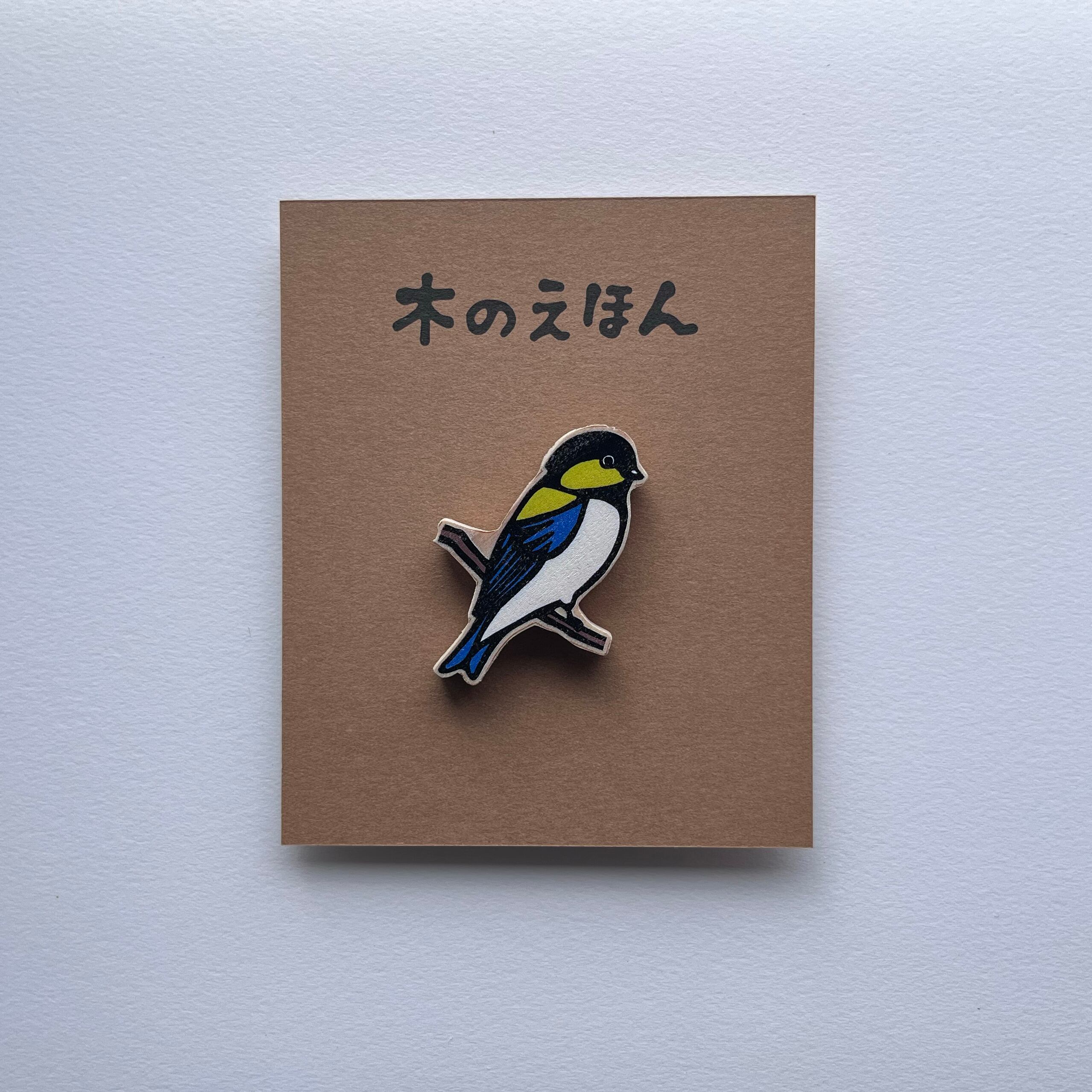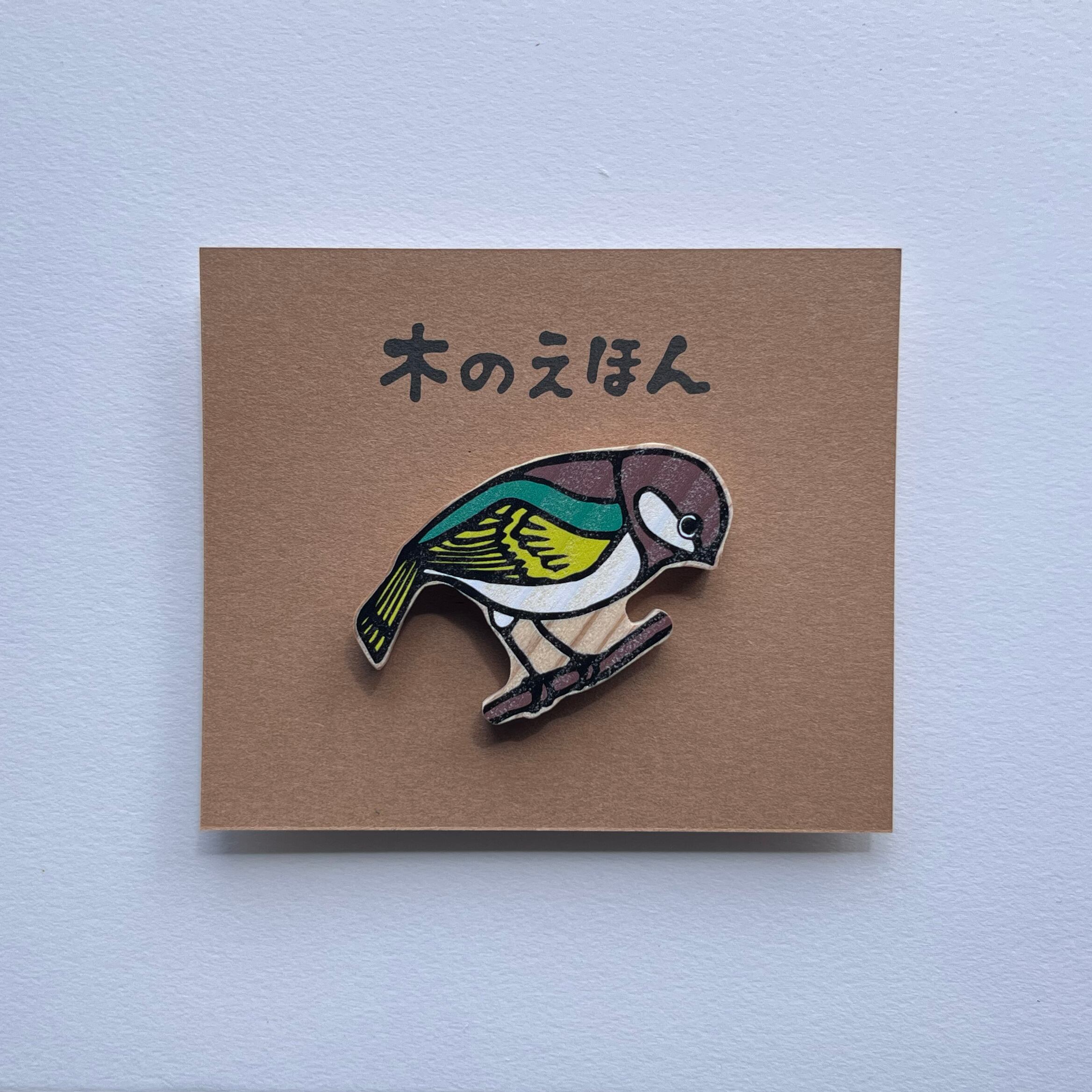 本品は「木のえほん」の製作過程でどうしても出てしまう、印刷ミスや加工ミスの材料をリサイクルし、新たに産まれたピンズ&バッジです。木のえほんの製作もしている「ねっこ作業所(就労継続支援B型事業所)」の利用者の皆さんが、1個1個、糸鋸による手加工で製作しています。