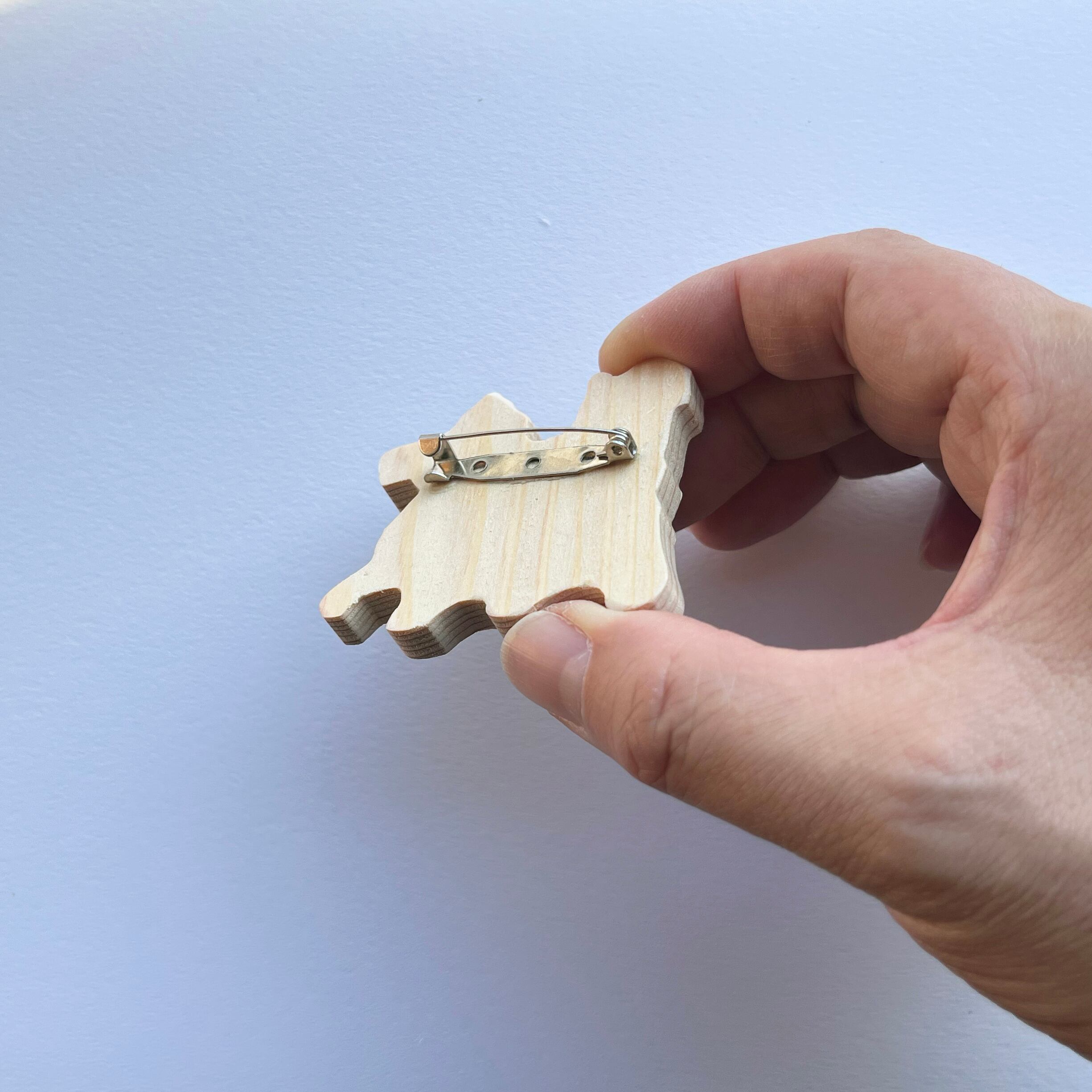 本品は「木のえほん」の製作過程でどうしても出てしまう、印刷ミスや加工ミスの材料をリサイクルし、新たに産まれたピンズ&バッジです。木のえほんの製作もしている「ねっこ作業所(就労継続支援B型事業所)」の利用者の皆さんが、1個1個、糸鋸による手加工で製作しています。